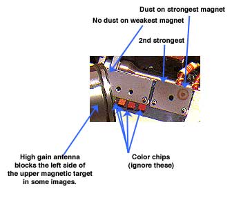 One of the science investigations performed by the Mars Pathfinder lander was the magnetic properties experiment, which used magnets to collect magnetic dust particles from the air. (The results of the experiment are consistent water being present on the surface in the distant past.) The science team periodically took camera images of the magnets and eagerly examined the images to see whether dust was collecting. The magnetic properties team, who were from a university in Denmark, spotted dust right away in some of the earliest images, but it was so hard to see in the (unprocessed) images that the joke among the science team was that Danes must have superior eyesight, because the other scientists couldn't see anything on the magnets.